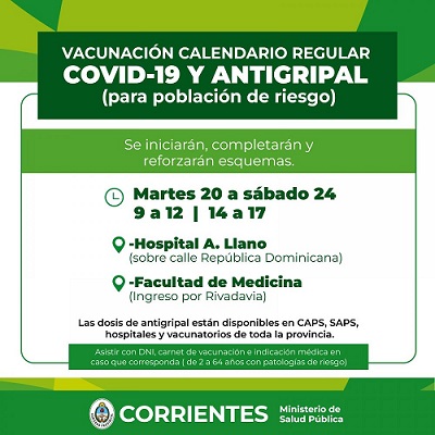En la capital, las dosis antigripales están disponibles para la población de riesgo en todos los Caps, Saps y en los vacunatorios de los hospitales Llano , Pediátrico y en la Facultad de Medicina y, en el interior, en todos los vacunatorios. El Ministerio de Salud Pública de la Provincia, a través de la Dirección de Inmunizaciones, continúa con la Campaña de Vacunación Antigripal 2023 para la población de riesgo y Covid-19.